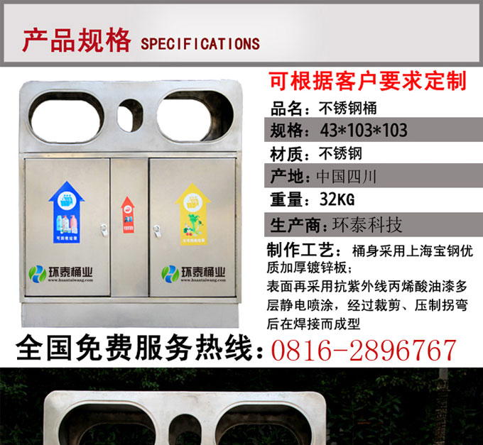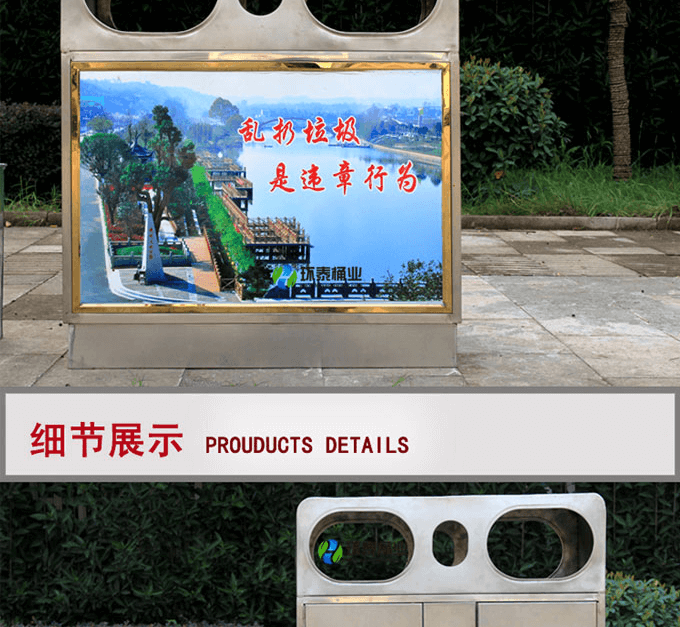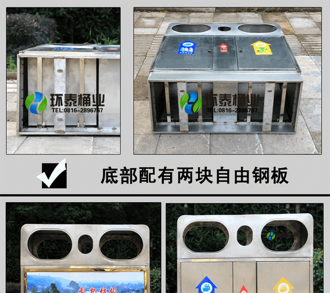 不銹鋼垃圾桶HT-BXG1510,該產(chǎn)品整體采用優(yōu)質(zhì)的不銹鋼鋼板生產(chǎn)加工而成,產(chǎn)品顏色為:銀色,規(guī)格為長700mm寬350mm高780mm,本款雙口不銹鋼分類垃圾桶采用模具沖壓或折邊拼焊成型;表面處理有鏡面與砂面兩種。金屬框架選用高品質(zhì)鋼板折邊拼焊成型,表面防銹處理后經(jīng)戶外粉末噴涂;木材經(jīng)烘干、打磨、倒角、防腐處理后表面噴涂進口抗紫外線聚脂漆。生產(chǎn)工藝:不銹鋼垃圾桶選用優(yōu)質(zhì)不銹鋼經(jīng)下料—折合—壓筋—沖孔―成型,氬氟焊、打磨、拋光、打臘。頂蓋采用滾壓成型技術,HT-BXG1510不銹鋼垃圾桶也可按照您的具體需求可定制尺寸和顏色,可印制LOGO及文字,詳見說明或咨詢客服.環(huán)泰愿為環(huán)保護航,一切為您,放心采購。