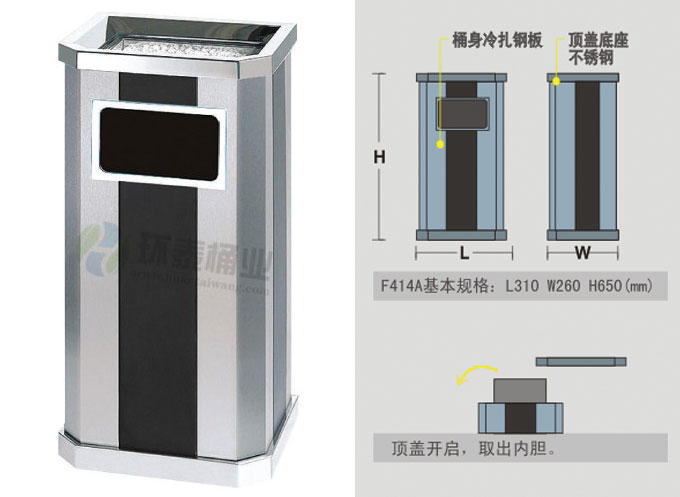 不銹鋼垃圾桶HT-BXG085,該產(chǎn)品整體采用優(yōu)質(zhì)的鍍鋅鋼板生產(chǎn)加工而成,產(chǎn)品顏色為:銀色+黑色,規(guī)格為長310mm寬260mm高645mm,本款室內(nèi)座地靠墻式不銹鋼垃圾桶采用模具沖壓或折邊拼焊成型;表面處理有鏡面與砂面兩種。金屬框架選用高品質(zhì)鋼板折邊拼焊成型,表面防銹處理后經(jīng)戶外粉末噴涂;木材經(jīng)烘干、打磨、倒角、防腐處理后表面噴涂進口抗紫外線聚脂漆。生產(chǎn)工藝:不銹鋼垃圾桶選用優(yōu)質(zhì)不銹鋼經(jīng)下料—折合—壓筋—沖孔―成型,氬氟焊、打磨、拋光、打臘。頂蓋采用滾壓成型技術(shù),HT-BXG085不銹鋼垃圾桶也可按照您的具體需求可定制尺寸和顏色,可印制LOGO及文字,詳見說明或咨詢客服.環(huán)泰愿為環(huán)保護航,一切為您,放心采購。