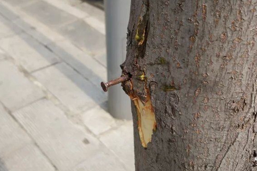 綿陽市城市管理行政執(zhí)法局有關負責人稱,往樹上釘釘子違反城市園林綠化管理建設條例之規(guī)定,擅自砍伐、損壞城市樹木花草的違法行為都將會受到相關行政處罰。由于當初摘樹的時候,需要支架對樹進行固定,所以樹干上殘留了很多釘子,不僅對樹木有影響,更是安全隱患。
