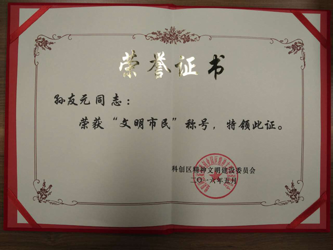 熱烈祝賀我司總經(jīng)理孫友元榮獲綿陽科創(chuàng)園區(qū)“文明市民”榮譽(yù)稱號(hào)