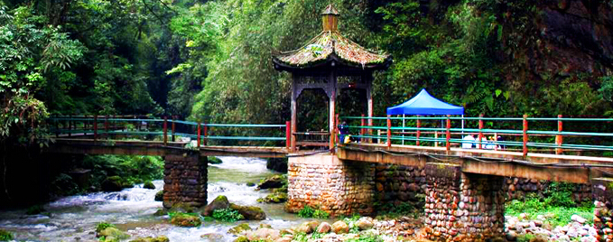 黑山谷風(fēng)景區(qū)原始生態(tài)風(fēng)景由峻嶺、峰林、幽峽、峭壁、森林、竹海、飛瀑、碧水、溶洞、仿古棧道、浮橋、云海、田園、原始植被、珍稀動(dòng)植物等各具特色的景觀組成.從景區(qū)大門進(jìn)入,上面是森林和山地,呈階梯狀地形河谷斷面呈“V”字形,河面狹窄.