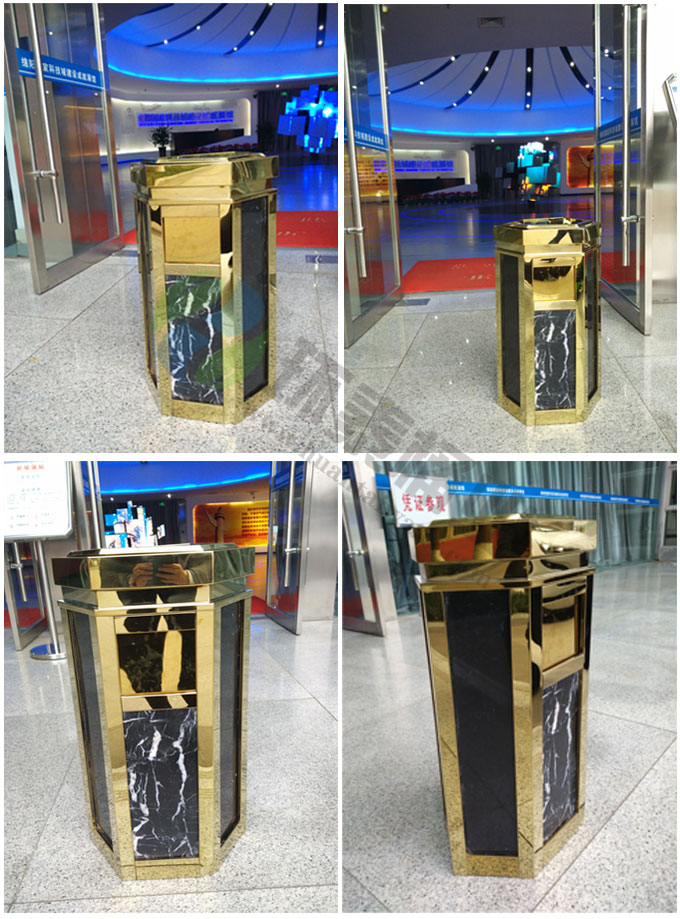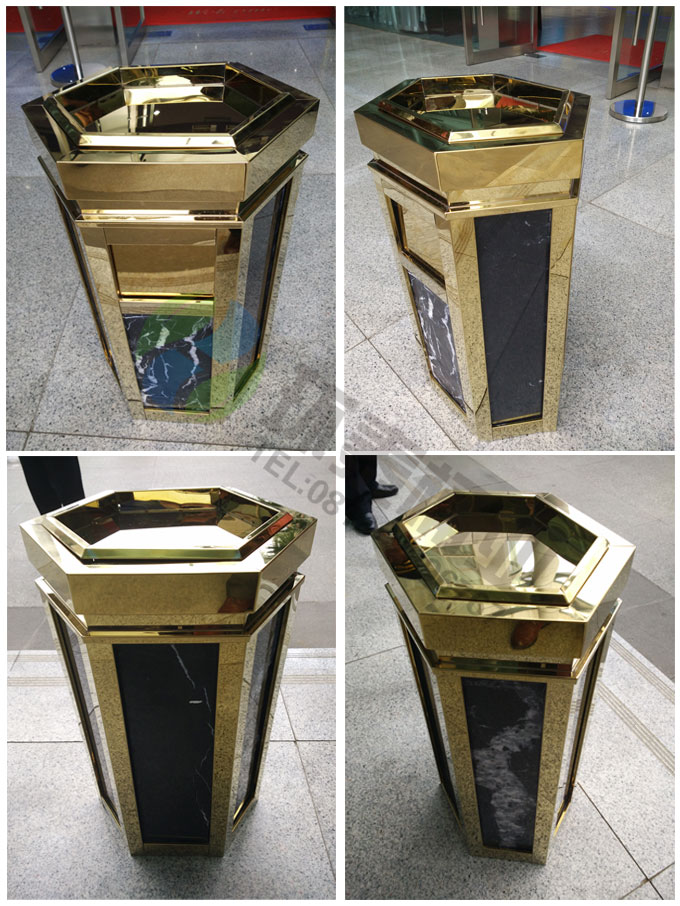 鈦金垃圾桶HT-SN013,該產(chǎn)品整體采用優(yōu)質(zhì)的鈦金板,大理石生產(chǎn)加工而成,產(chǎn)品顏色為:鈦金色,規(guī)格為長(zhǎng)400mm寬400mm高650mm,本款六邊形上投口酒店大理石垃圾桶采用天然的大理石與優(yōu)質(zhì)冷軋鋼板或不銹鋼鋼板制作而成,四面大理石用鋼板螺絲固定于桶體,有內(nèi)桶,方便提倒垃圾,桶頭煙灰盅可放白石子,石子可清洗.鋼板經(jīng)折彎沖壓一次性成型.產(chǎn)品一律用室外粉靜電噴塑,經(jīng)過(guò)180°的高溫,限度延長(zhǎng)了垃圾桶的使用壽命,使垃圾桶顏色持久不變,亮麗如新.表面經(jīng)除油——清洗——酸洗——清洗——表調(diào)——磷化——清洗——烘干——靜電粉末噴涂——高溫塑化——冷卻.噴涂粉末經(jīng)ISO9002質(zhì)量體系認(rèn)證,產(chǎn)品易保潔表面光滑之優(yōu)點(diǎn),不脫落,不起層,HT-SN013鈦金垃圾桶也可按照您的具體需求僅定制顏色,詳見(jiàn)說(shuō)明或咨詢客服.環(huán)泰愿為環(huán)保護(hù)航,一切為您,放心采購(gòu)。