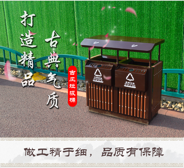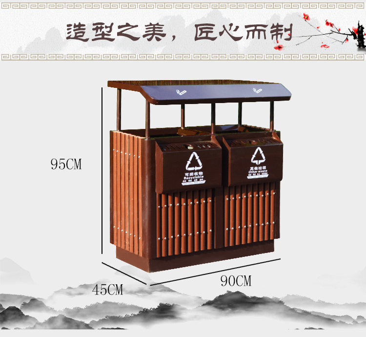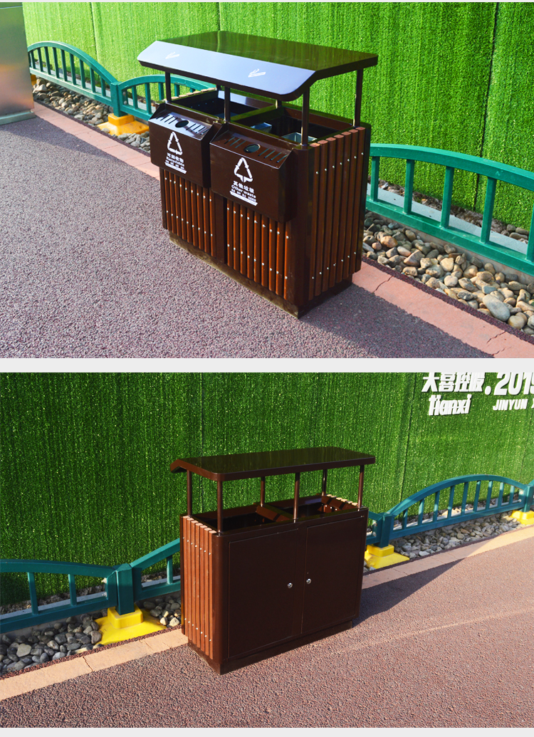 鋼木垃圾桶HT-GM6670,該產(chǎn)品整體采用優(yōu)質(zhì)的鍍鋅鋼板生產(chǎn)加工而成,產(chǎn)品顏色為:黑,規(guī)格為長(zhǎng)900mm寬450mm高950mm,本款戶外塑木分類垃圾桶制造工藝采用:1、塑木垃圾桶桶身采用優(yōu)質(zhì)塑木制作,塑木是利用聚乙烯、聚丙烯和聚氯乙烯等,代替通常的樹脂膠粘劑,與超過 35%-70%以上的木粉、稻殼、秸稈等廢植物纖維混合成新的木質(zhì)材料,再經(jīng)擠壓、模壓、注塑成型等塑料加工工藝,生產(chǎn)出的新型材料,可抑制微生物的寄生、繁殖與蛀蝕,具有防水、防霉等保護(hù)功效,能夠抑制霉菌和藻類生物的生長(zhǎng),可有效減少紫外線導(dǎo)致的褪色,延長(zhǎng)木材在戶外環(huán)境中的使用壽命.2、塑木垃圾箱采用鍍鋅鋼板材質(zhì)制作,鋼結(jié)構(gòu)均經(jīng)過酸洗、磷化表面處理,然后再使用高溫噴塑工藝,使垃圾桶更加經(jīng)久耐用,防腐、防銹,美觀大方.3、塑木果皮箱采用內(nèi)部膨脹螺栓固定的方式,不易推到,不易被偷盜,使垃圾桶更加安全牢實(shí).隱形固定還可以防止撞傷行人.,HT-GM6670鋼木垃圾桶也可按照您的具體需求可定制尺寸和顏色,詳見說明或咨詢客服.環(huán)泰愿為環(huán)保護(hù)航,一切為您,放心采購。