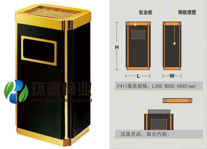 鋼制垃圾桶HT-SN014,該產(chǎn)品整體采用優(yōu)質的鍍鋅鋼板,鈦金板,大理石生產(chǎn)加工而成,產(chǎn)品顏色為:黑加金色,規(guī)格為長360mm寬280mm高680mm,本款金霸王方形式座地垃圾桶整體采用優(yōu)質冷軋鋼板,經(jīng)折彎沖壓一次性成型.產(chǎn)品一律用室外粉靜電噴塑,經(jīng)過180°的高溫,限度延長了垃圾桶的使用壽命,使垃圾桶顏色持久不變,亮麗如新.表面經(jīng)除油——清洗——酸洗——清洗——表調(diào)——磷化——清洗——烘干——靜電粉末噴涂——高溫塑化——冷卻.噴涂粉末經(jīng)ISO9002質量體系認證,易保潔表面光滑之優(yōu)點,不脫落,不起層,HT-SN014鋼制垃圾桶也可按照您的具體需求僅定制顏色,詳見說明或咨詢客服.環(huán)泰愿為環(huán)保護航,一切為您,放心采購。