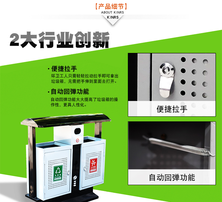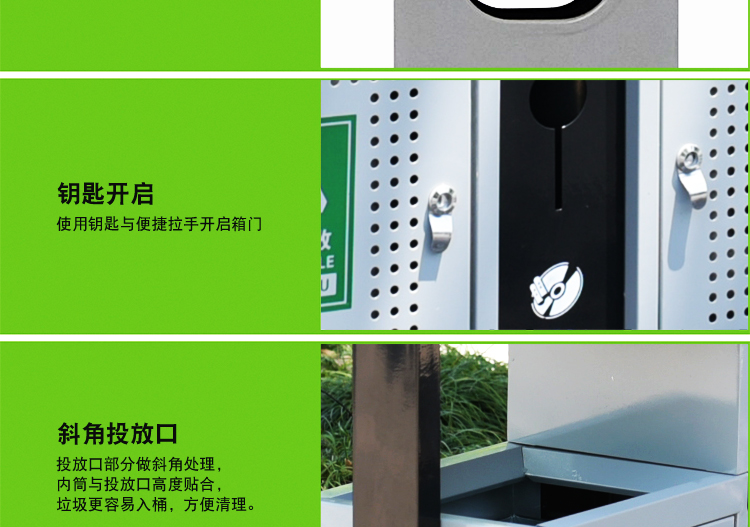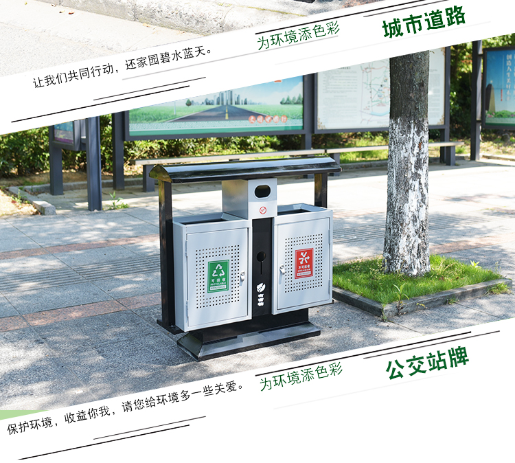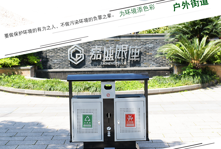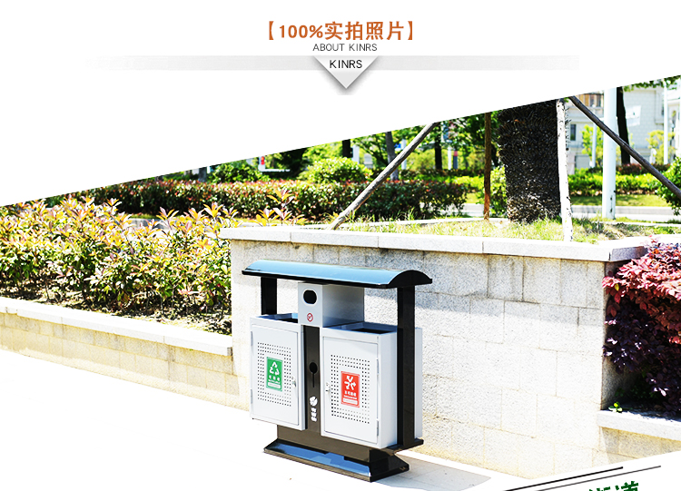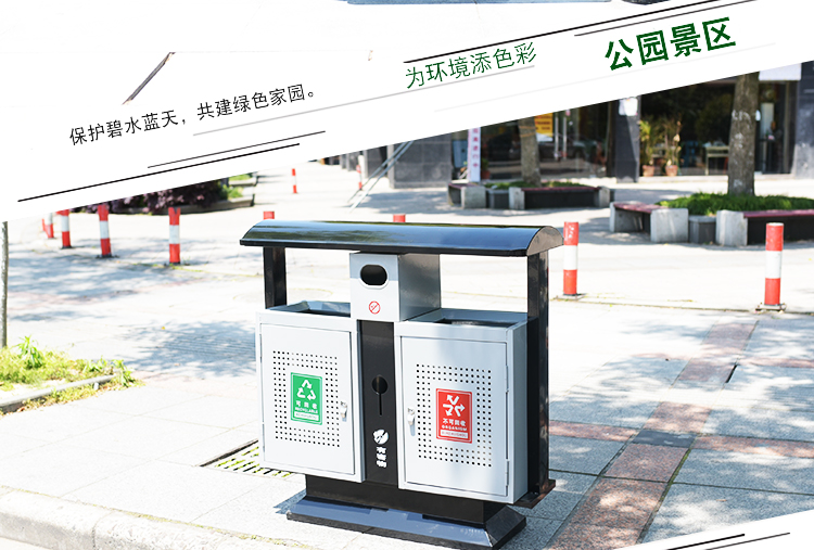 鋼制垃圾桶HT-GZ5690,該產(chǎn)品整體采用優(yōu)質(zhì)的鍍鋅鋼板生產(chǎn)加工而成,產(chǎn)品顏色為:黑灰色,規(guī)格為長1000mm寬350mm高1000mm,本款戶外分類鋼制北京桶整體采用優(yōu)質(zhì)鍍鋅板,經(jīng)折彎沖壓一次性成型.產(chǎn)品一律用室外粉靜電噴塑,經(jīng)過180°的高溫,限度延長了垃圾桶的使用壽命,使垃圾桶顏色持久不變,亮麗如新.表面經(jīng)除油——清洗——酸洗——清洗——表調(diào)——磷化——清洗——烘干——靜電粉末噴涂——高溫塑化——冷卻.噴涂粉末經(jīng)ISO9002質(zhì)量體系認證,易保潔表面光滑之優(yōu)點,不脫落,不起層。,HT-GZ5690鋼制垃圾桶也可按照您的具體需求可定制尺寸和顏色,可印制LOGO及文字,詳見說明或咨詢客服.環(huán)泰愿為環(huán)保護航,一切為您,放心采購。