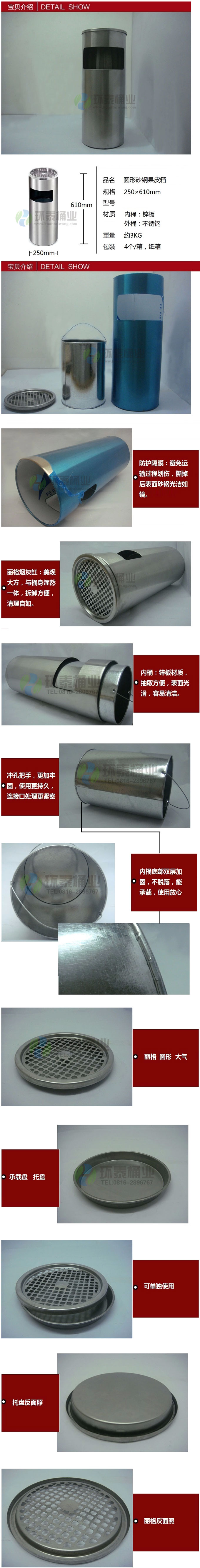鋼制垃圾桶HT-SN107,該產(chǎn)品整體采用優(yōu)質(zhì)的鍍鋅鋼板生產(chǎn)加工而成,產(chǎn)品顏色為:黑色,規(guī)格為直徑250mm高610mm,本款麗格圓形金圈室內(nèi)垃圾桶采用模具沖壓或折邊拼焊成型;表面處理有鏡面與砂面兩種。金屬框架選用高品質(zhì)鋼板折邊拼焊成型,表面防銹處理后經(jīng)戶外粉末噴涂;木材經(jīng)烘干、打磨、倒角、防腐處理后表面噴涂進口抗紫外線聚脂漆。生產(chǎn)工藝:不銹鋼垃圾桶選用優(yōu)質(zhì)不銹鋼經(jīng)下料—折合—壓筋—沖孔―成型,氬氟焊、打磨、拋光、打臘。頂蓋采用滾壓成型技術(shù),HT-SN107鋼制垃圾桶也可按照您的具體需求可定制尺寸和顏色,可印制LOGO及文字,詳見說明或咨詢客服.環(huán)泰愿為環(huán)保護航,一切為您,放心采購。
