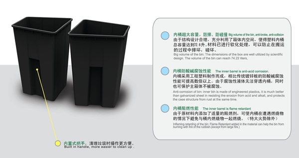 箱體鋼板外包圍采用高強(qiáng)度、耐候性、V0級(jí)阻燃工程塑料材料整體注塑制成,保證箱體整體無(wú)任何焊接點(diǎn),消除箱體產(chǎn)生腐蝕生銹的可能性。垃圾投放內(nèi)桶采用高強(qiáng)度、耐候性、V0級(jí)別阻燃工程塑料制作,總?cè)萘扛哌_(dá)80L。