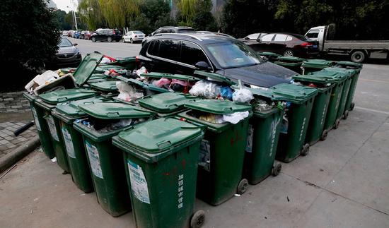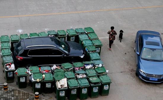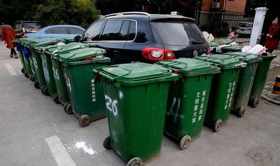 記者在現(xiàn)場看到,每個垃圾桶都有一米多高,近半米寬。遠(yuǎn)遠(yuǎn)地看過去,私家車只露出了車頂部分。
