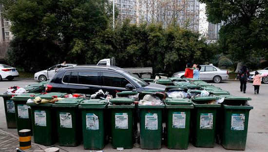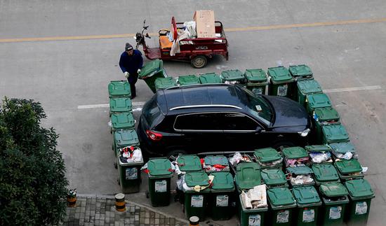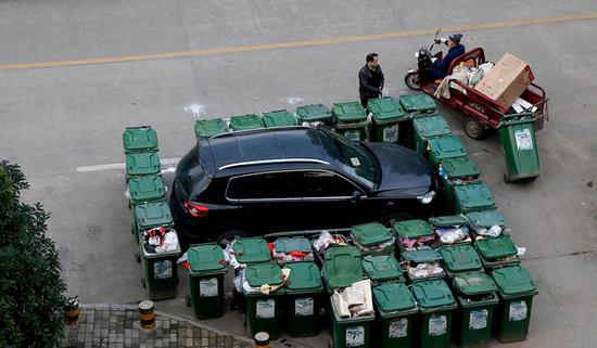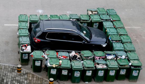 12月17日下午4點多,安徽合肥市龍圖路翠庭園小區(qū)北門外,一輛停在路口皖A(yù)牌照的SUV私家車因占用垃圾中轉(zhuǎn)點停車,被四十多個垃圾桶圍得“水泄不通”。
