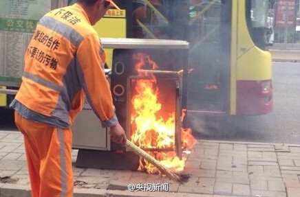 【[話筒]請將煙頭掐滅后再丟進(jìn)垃圾桶】今天中午12點(diǎn)左右,山東濟(jì)南市濼源大街東頭公交站牌的一個垃圾桶著火。正在滅火的環(huán)衛(wèi)工人說,起火原因多半是有人將未掐滅的煙頭丟進(jìn)垃圾桶。垃圾桶內(nèi)常有大量廢紙或塑料袋等易燃物品,提醒大家,丟煙頭前,請先把煙頭掐滅。