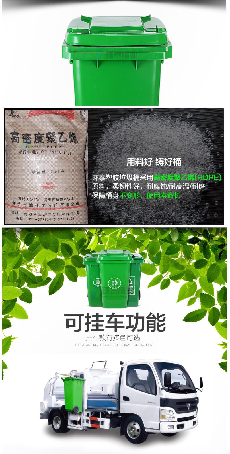 1、100%高密度聚乙烯原料注塑成型,耐酸、耐堿、耐腐蝕;HT-SL240G環(huán)衛(wèi)掛車垃圾桶:針對掛車設(shè)計。背后有掛車專用卡槽,容易掛車,不易受損,承重更強。