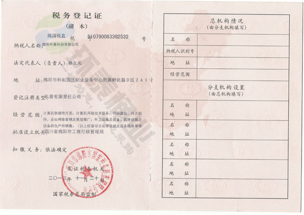 環(huán)泰科技國家稅務(wù)登記證