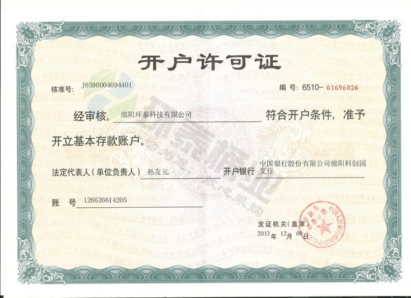 環(huán)泰科技中國(guó)銀行開(kāi)戶許可證